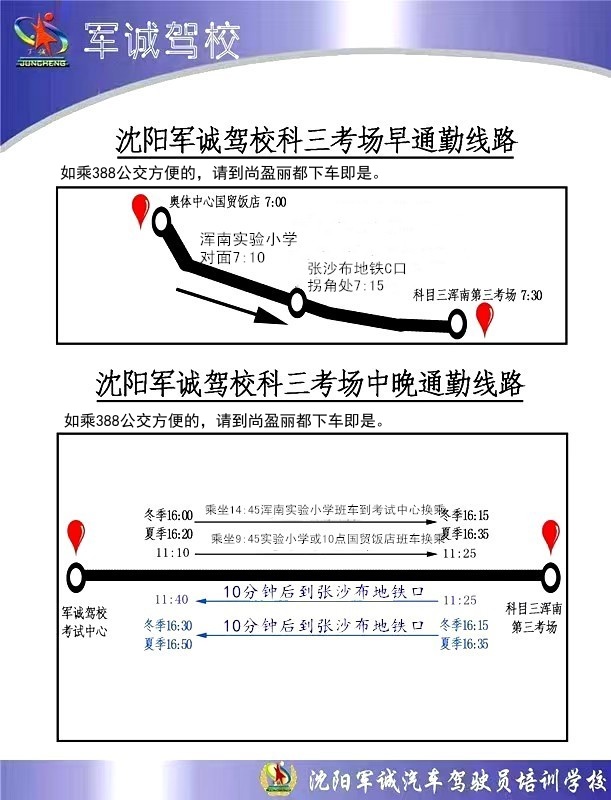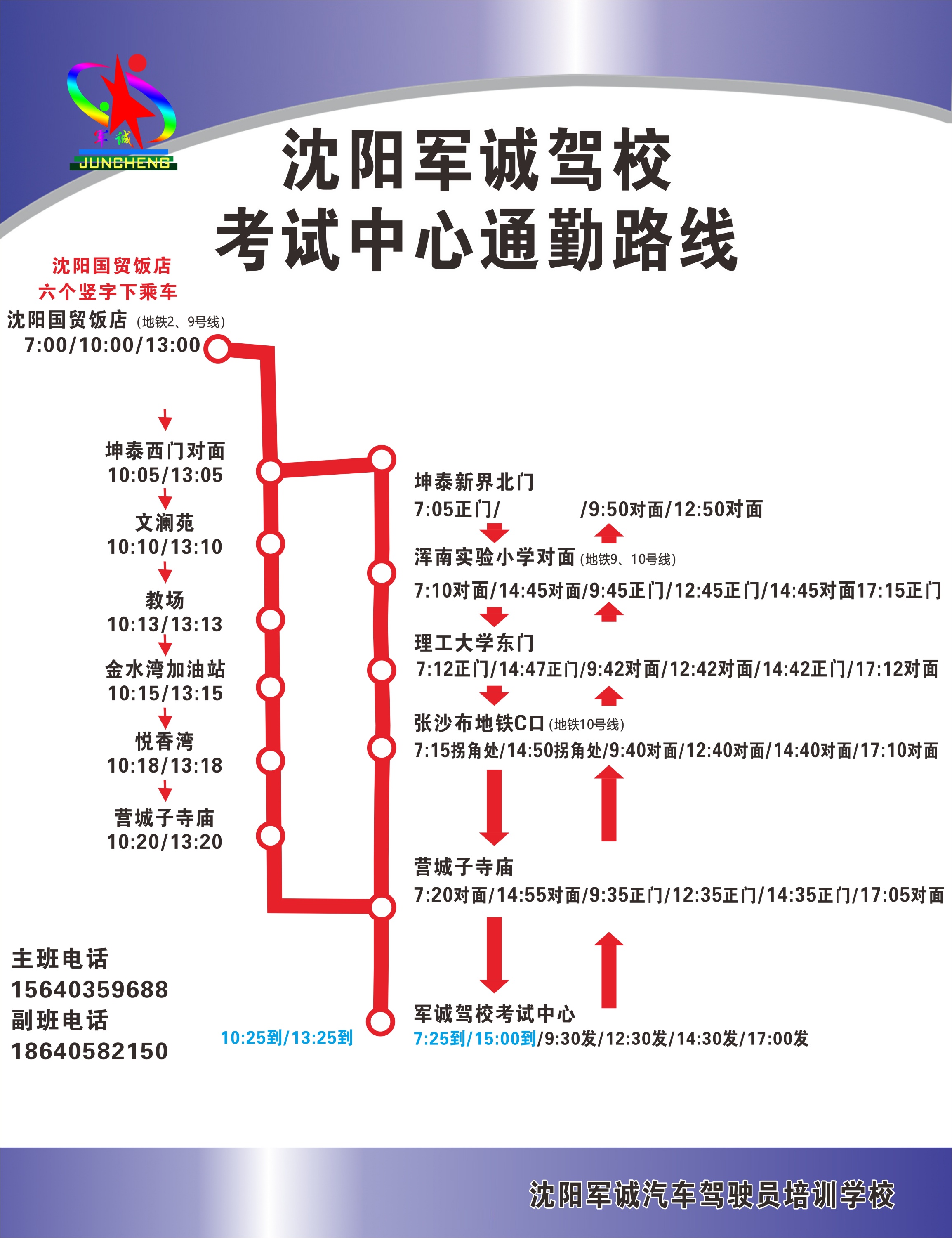 沈阳军诚驾校通勤路线 1.军诚驾校通勤班车时间站点表 2.科目一科目四车管所通勤路线 3.军诚驾校考试中心科目二通勤路线 4.柏繁街科目三通勤路线